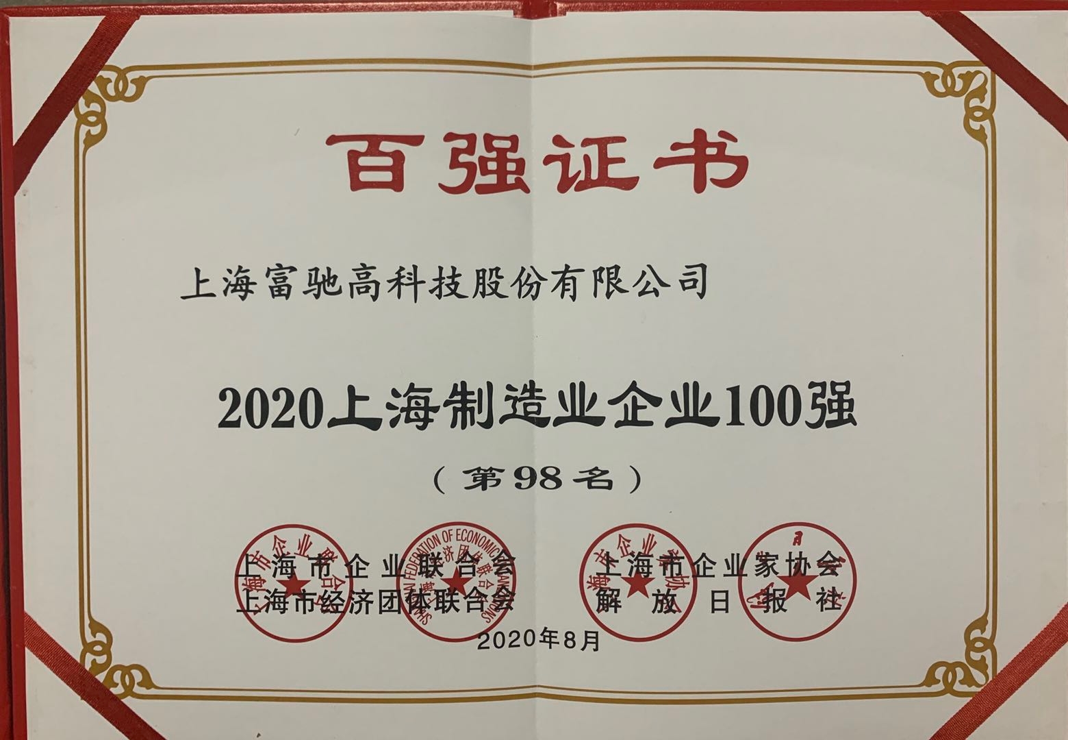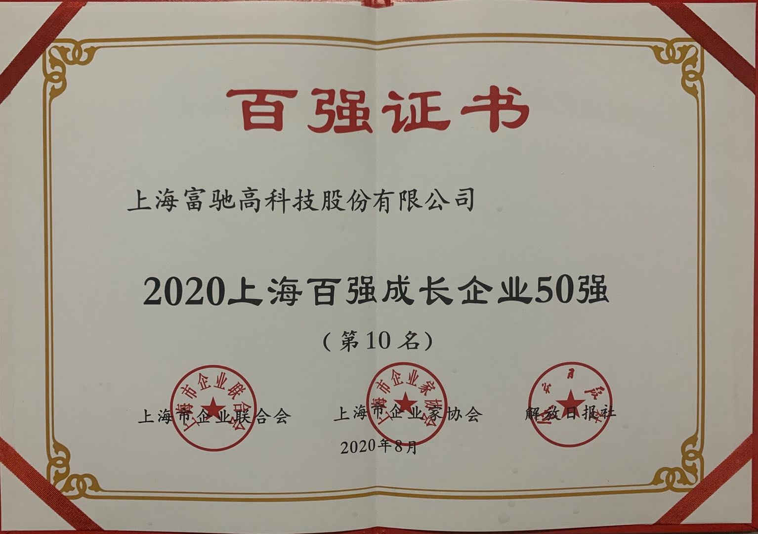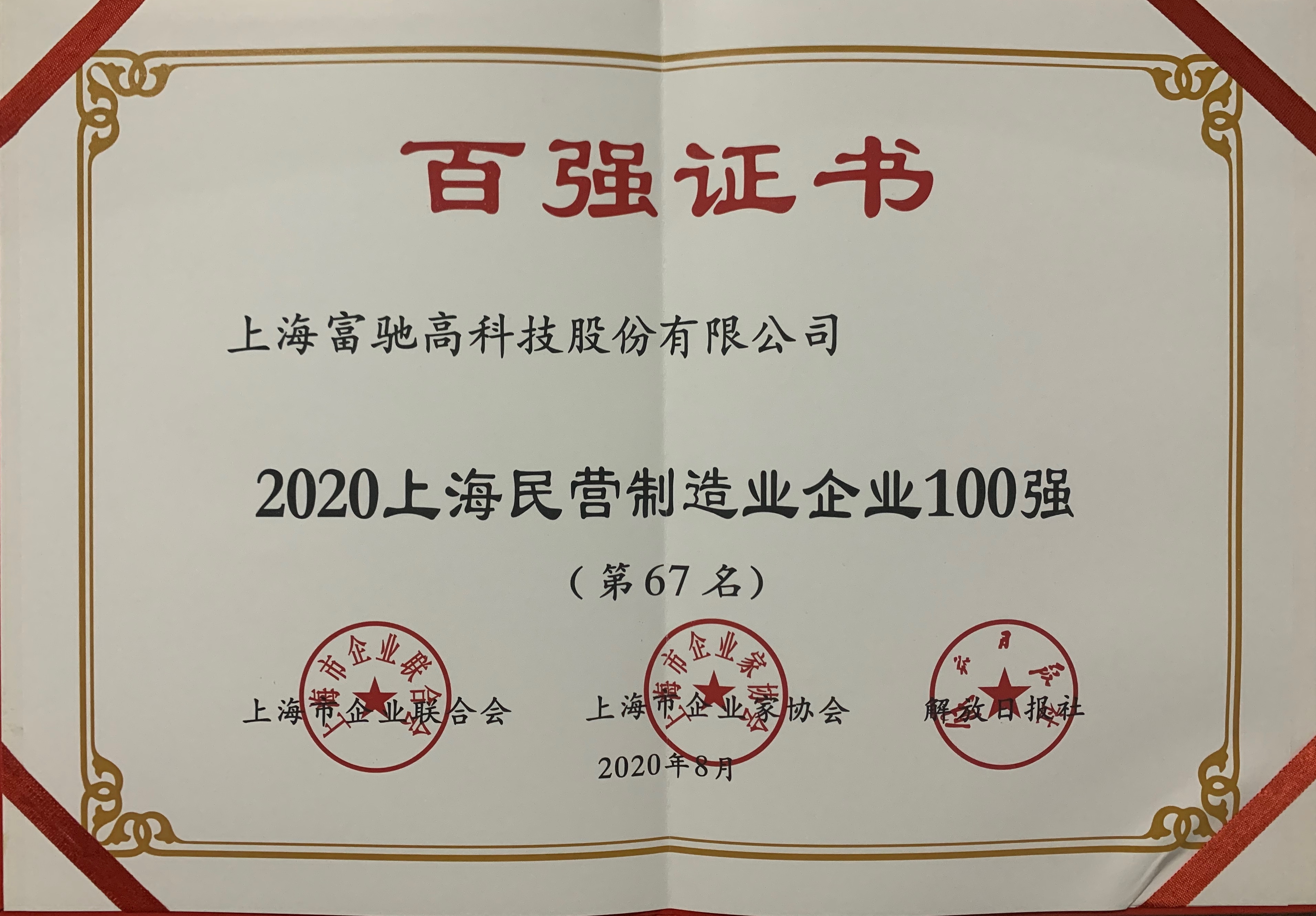 繼2019年我司獲頒同類榮譽(yù)后,我司在這次發(fā)布會(huì)上又獲頒三份“上海百?gòu)?qiáng)企業(yè)”證書,分別是“2020上海民營(yíng)制造業(yè)企業(yè)100強(qiáng)”、“2020上海百?gòu)?qiáng)成長(zhǎng)企業(yè)50強(qiáng)”、“2020上海制造業(yè)企業(yè)100強(qiáng)”。